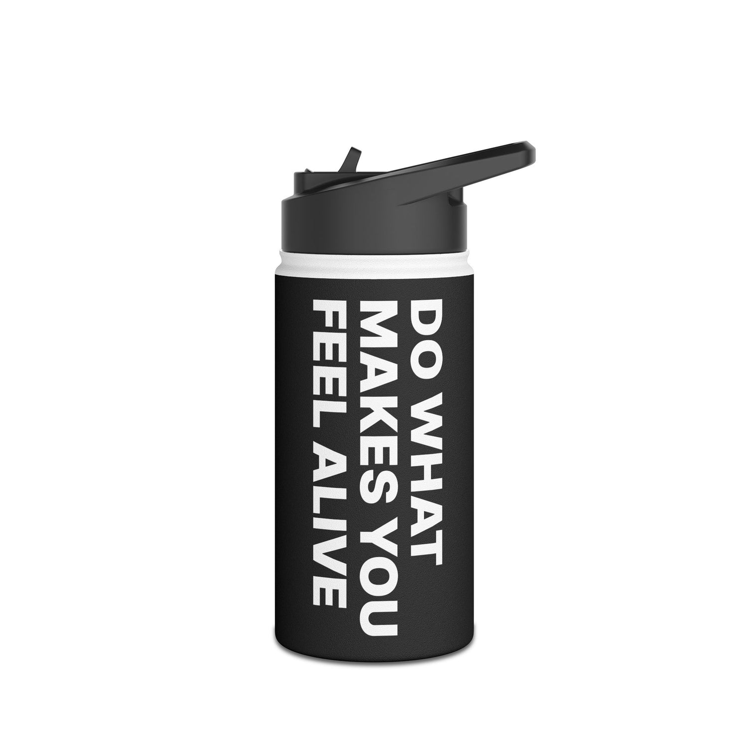 This matte black stainless steel water bottle carries a modern, motivational edge.